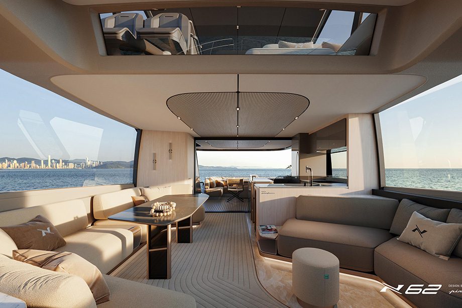 O interior do barco chega para impressionar, com amplas janelas panorâmicas, móveis refinados de design contemporâneo, acesso a proa por porta elétrica e um detalhe de ouro: pisos que seguem o mesmo nível.