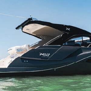 Essa lancha possui uma conexão contínua entre seus espaços internos e externos, permitindo que os navegadores experienciem plenamente seu ambiente enquanto estão na água. Grandes janelas e linhas dinâmicas adicionam à estética impressionante do barco, enquanto o grande cockpit e o toldo elétrico fornecem espaço amplo para entretenimento.